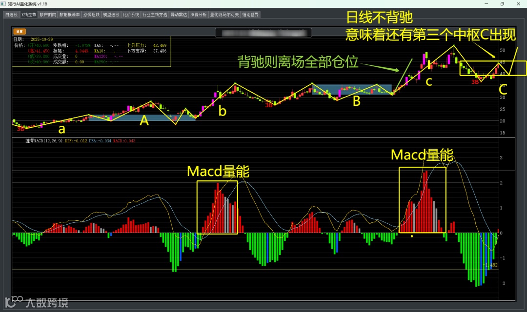 而c段的操作和b段完全一样,该走该留,全看当下的走势判断,不用做任何预测。只要没背驰,就说明可能还会有第三个中枢出现,就按这个逻辑循环即可。