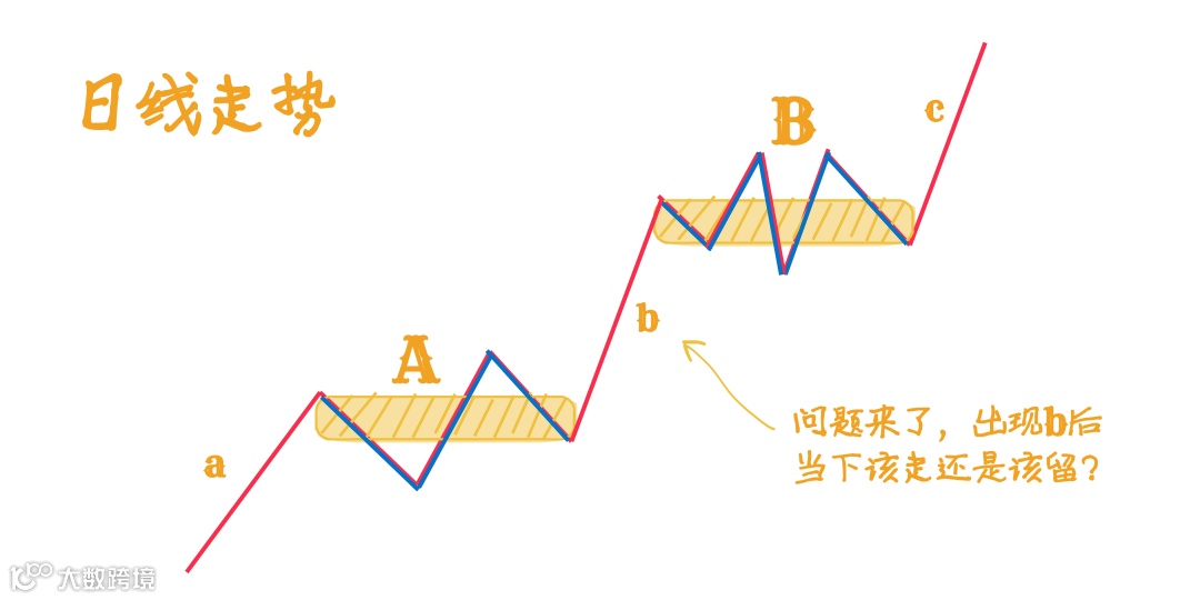 比如一个日线级别的向上走势,结构是a+A+b+B+c。你不可能在A走出来后,就断定一定会有b出现——这是预测,相当于默认有某种力量保证b必然存在,而这是不可能的。