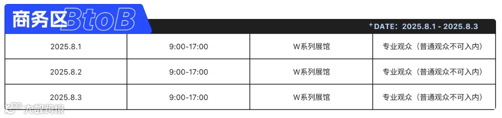 BTOB 综合商务洽谈区(W馆)展期:8 月1日 - 3日9:00-17:00。