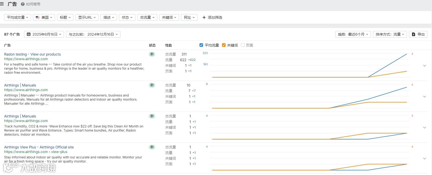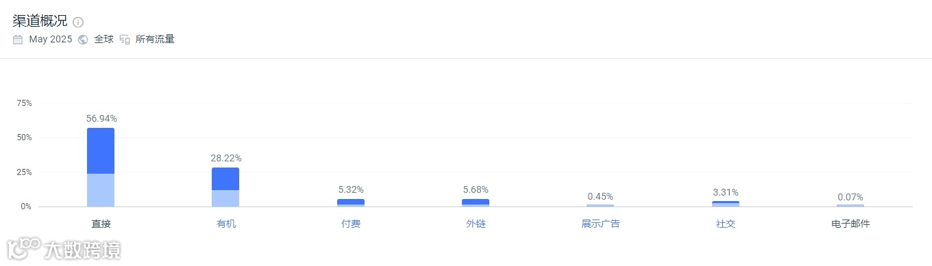 根据similarweb数据系那是,Airthings官网的流量主要来自于直接访问流量(56.94%)、自然搜索流量(28.22%)、外链(5.68%)、付费广告(5.32%)。