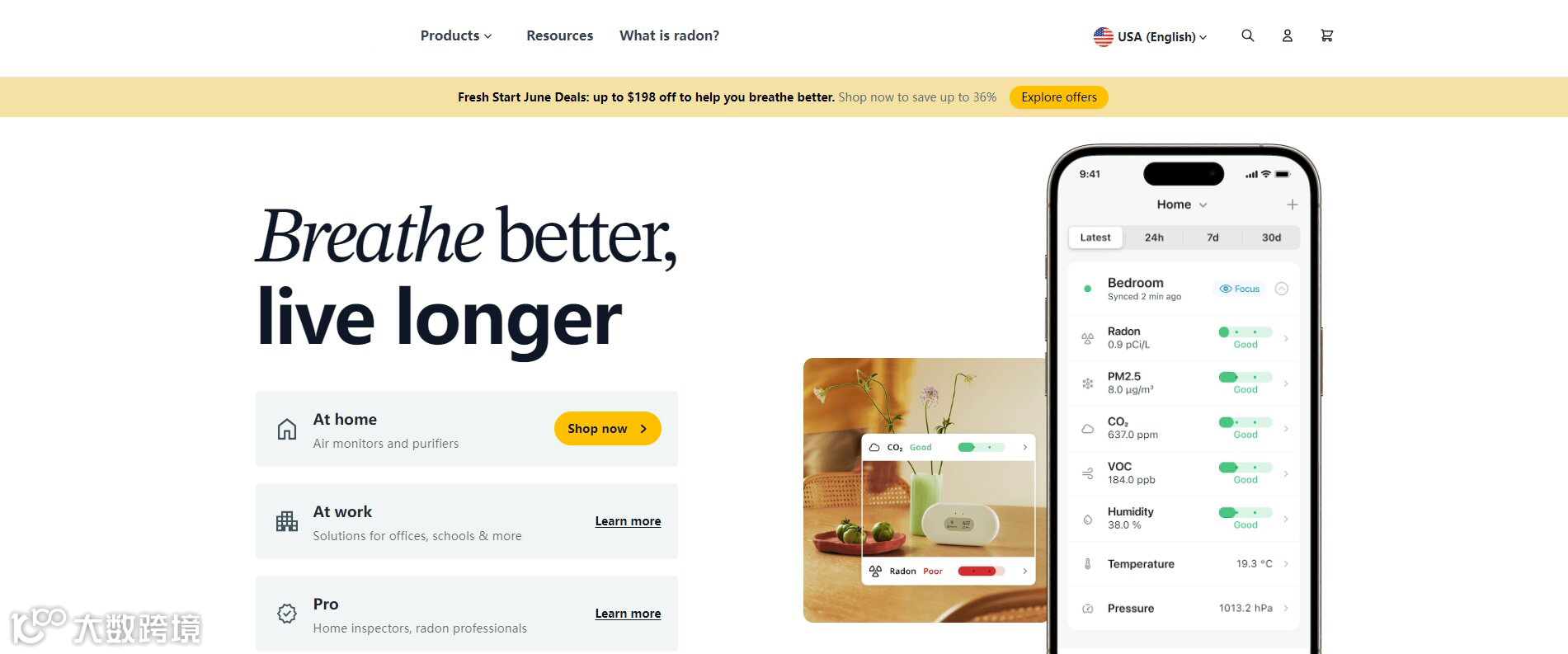 差异化定位:你可能没听说过氡气体,但它其实是一种无色无味的“隐形杀手”,被世界卫生组织列为导致肺癌的第二大元凶,仅次于吸烟。而Airthings正是少数将氡检测作为核心功能的空气检测品牌。