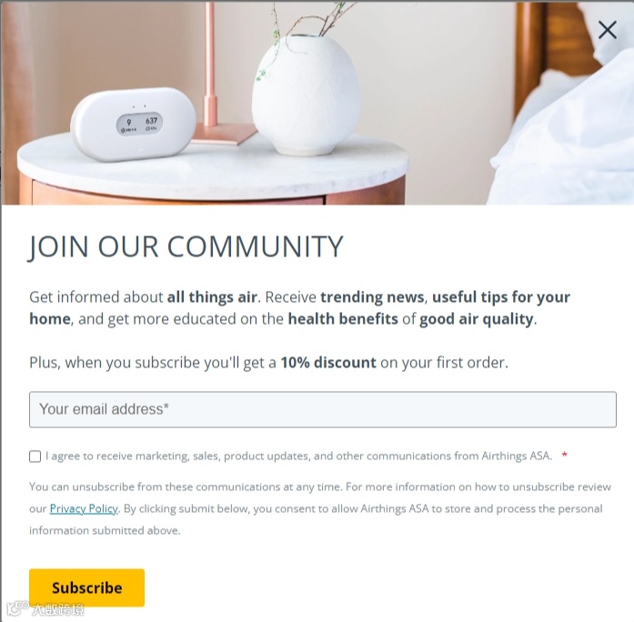 订阅折扣:Airthings在官网设置了“订阅立享10%折扣”的引导机制,这种折扣并非单纯的促销,而是建立在内容订阅与品牌教育基础上的价值交换。所以其既能提升消费者对优惠券的使用率,也能获取消费者的联系方式,为后续的再营销打下良好基础。