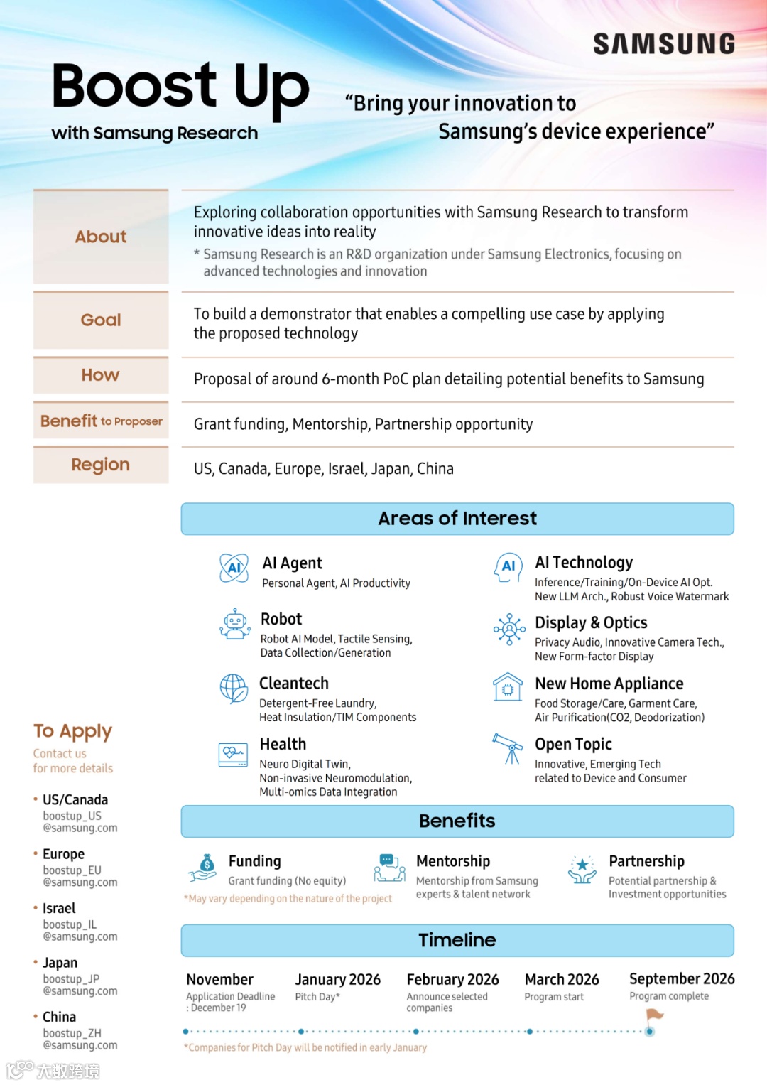这是一次将创新构想转化为现实生产力的绝佳机遇,三星研究院期待与全球初创精英并肩,以技术创新重塑消费电子体验,共创科技未来新篇章。