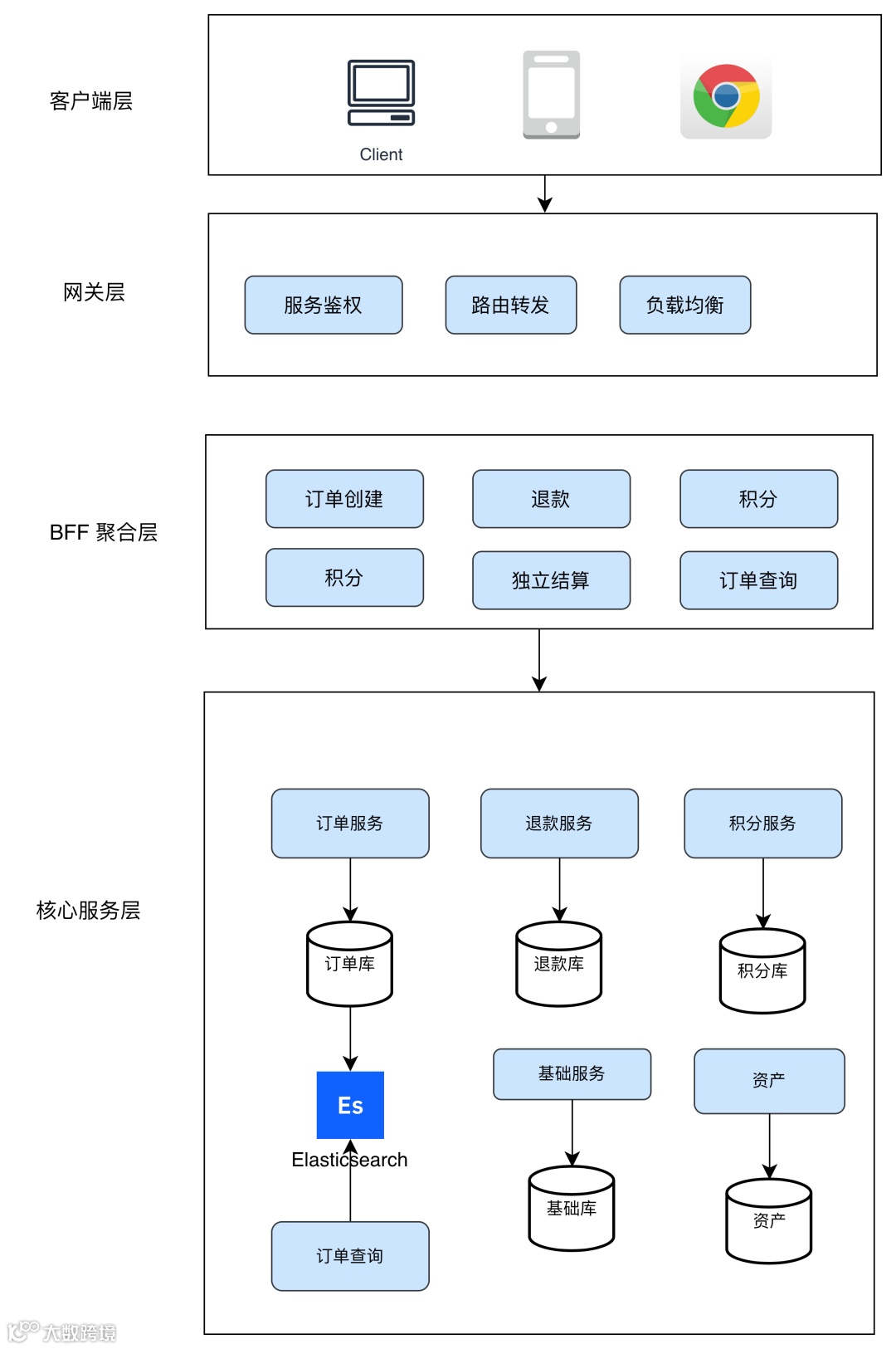 按照调用顺序,从上到下分为客户端层、表示层、业务逻辑层、DAO 数据访问层、DB 层。