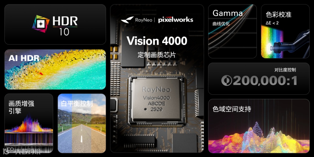 雷鸟与知名画质芯片厂商Pixelworks联合定制了专为AR眼镜设计的Vision 4000芯片,这款芯片的核心作用是优化每一针画面的动态范围、色彩和对比度,是实现HDR10显示和AI实时SDR转HDR的关键。