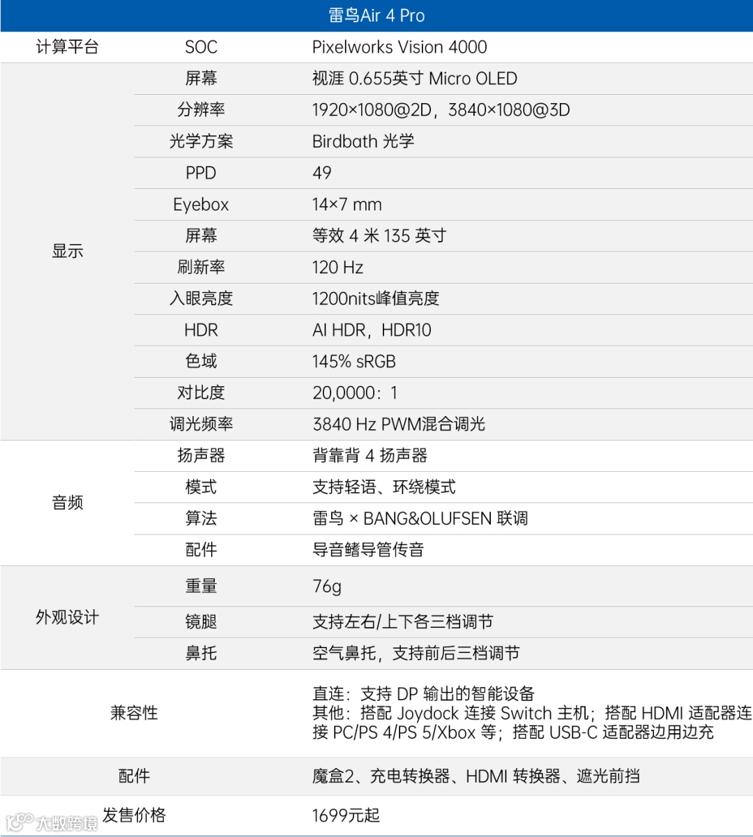 雷鸟Air 4 Pro内置四颗定制扬声器单元,采用行业独有的背靠背结构,由B&O声学工程师全程参与调校,调音风格中频细腻、人声突出,非常适合观影和追剧。
