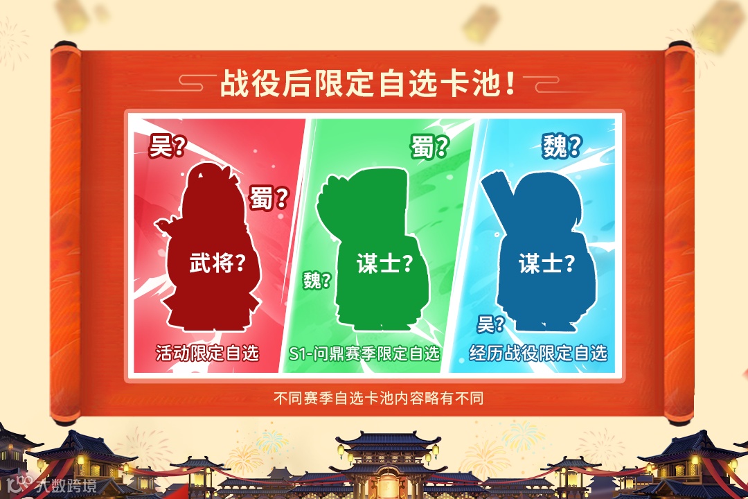 活动卡池除3个名将外,主公们可额外自选1位活动限定名将,2位不同赛季限定名将,让您的征战之路更添助力!