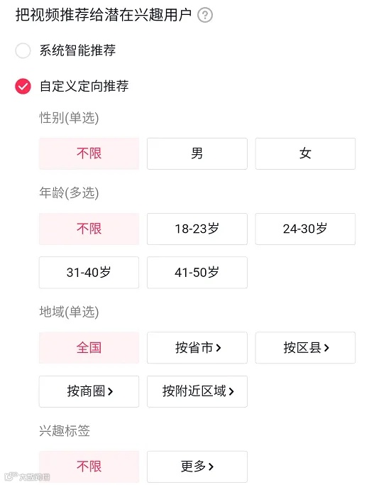 系统根据视频内容自动推荐给潜在兴趣用户,适合无明确目标人群的用户。支持批量智能投放功能。