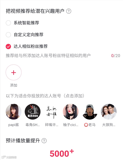 系统智能投放:系统根据内容推荐给潜在兴趣用户,适合无明确目标人群时使用。 自定义定向:可设定性别、年龄、地域、兴趣标签,适用于本地商家或精准营销场景。 达人相似粉丝投放:选择同类优质达人,系统将内容推送给其粉丝相似人群。支持美食、美妆、服装、教育等25个类目,最多可选20个达人。12、如何挑选相似达人?
