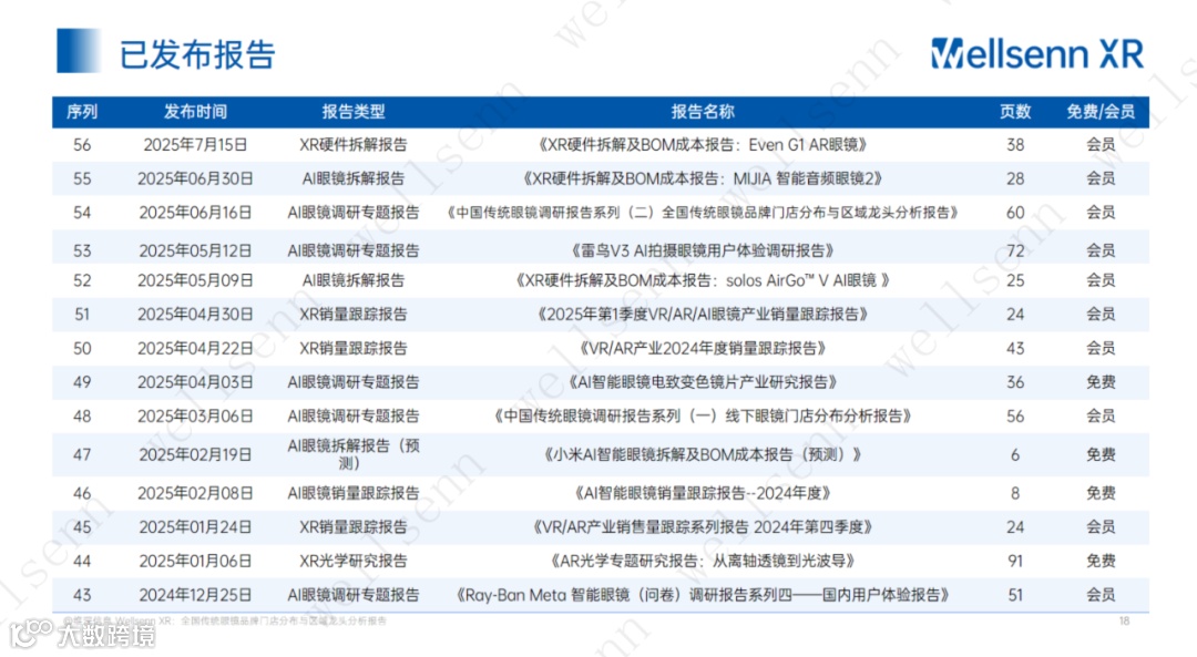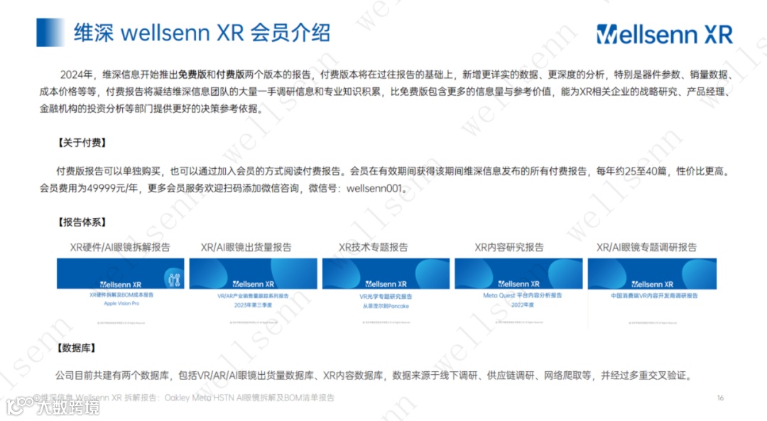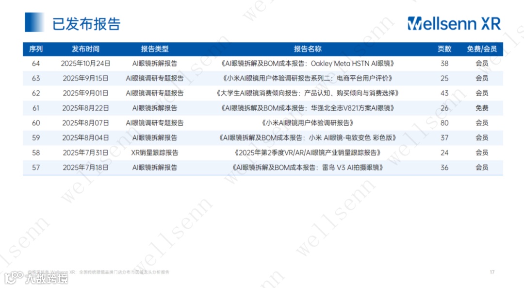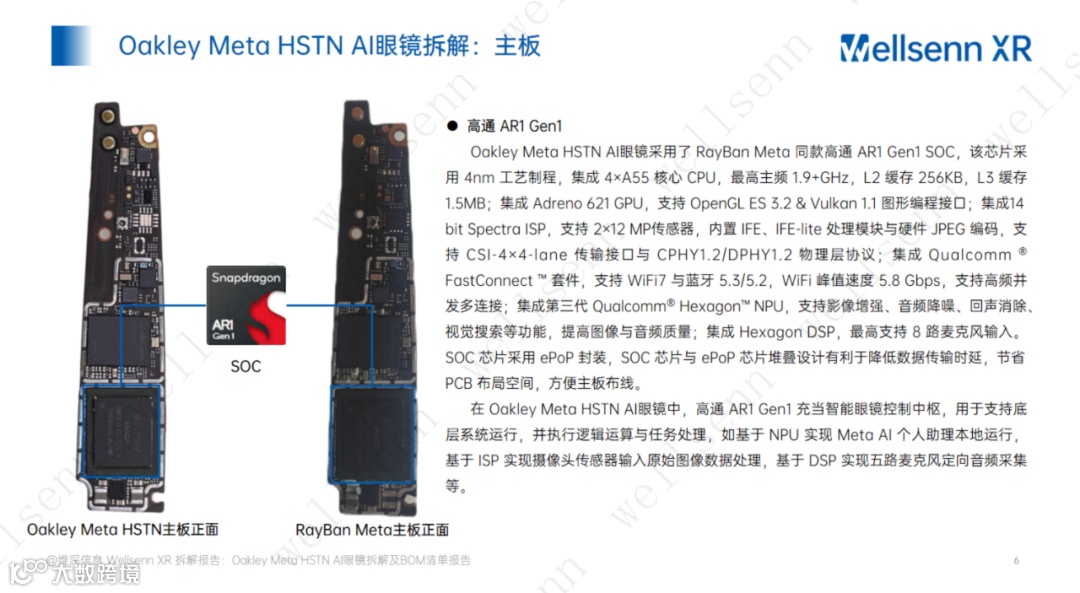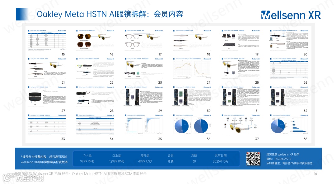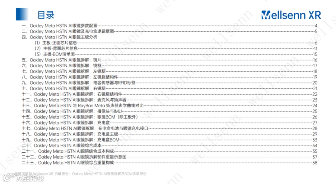 本报告会员完整版共38页,对 Oakley Meta HSTN AI眼镜进行了系统、全面的拆解分析,针对核心芯片、摄像头模组、音频模组、精密结构件等重要部件,进行原理作用、成本结构等分析,最终基于各项数据整理。完整版报告请付费购买或加入维深会员查看。