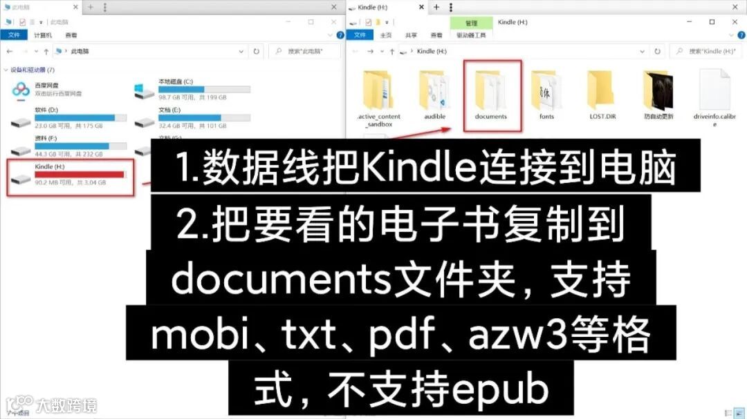 使用方法:连接电脑和 kindle 后,在电脑上【我的电脑】里打开 kindle 盘符,然后把你想看的书拖进【documents】文件夹里就ok了。