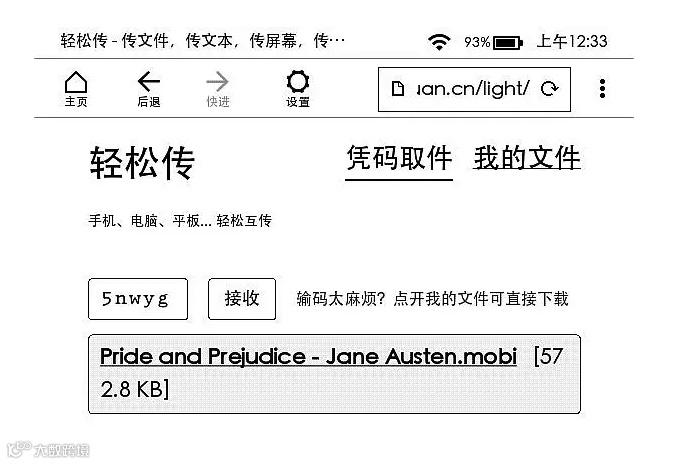 2. 打开 kindle 上的网页浏览器,输入easychuan的网址【https://easychuan.cn/】,然后填入上面的取件码,点击接收即可把电子书下载到 kindle,如下图所示。