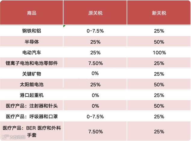 从今年开始,美国拜登政府将对中国进口电动汽车征收四倍关税,从 25% 提高到 100%。中国太阳能电池的进口税将翻倍,从25%增至50%。中国部分钢铁和铝进口关税将增加三倍以上,从目前的 7.5% 调高至25%。
