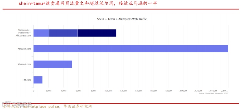 Shein、Temu、速卖通、TikTok等全托管平台以极致低价抢占市场,引发“低价风暴”。2023年11月,三者合计网页流量接近亚马逊一半,超过沃尔玛,行业竞争显著加剧。