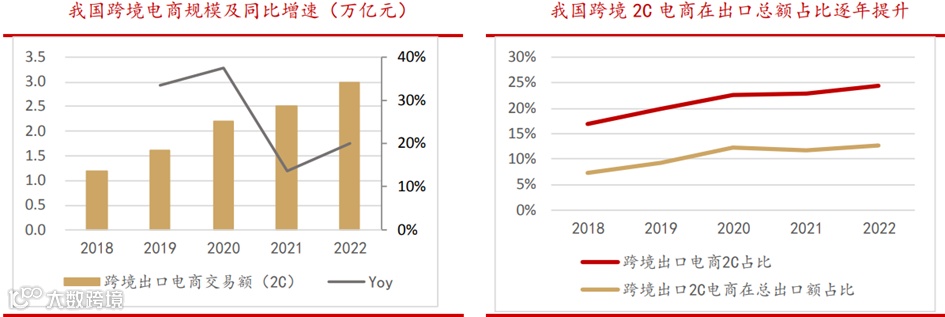 2022年中国跨境电商出口(2C)销售额达3万亿元,同比增长20%,占跨境出口电商比重24%,占总出口额13%,已成为国货出海重要渠道。