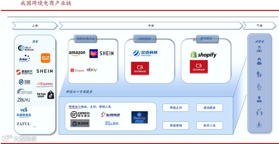 跨境电商涵盖采购、物流、仓储、营销、支付等环节。上游为工厂或商家,通过第三方平台(如亚马逊、美客多)或独立站销售。服务商提供支付、建站、营销支持,降低出海门槛。头部平台凭借高市占率获取高佣金,利润率较高;卖家竞争激烈,利润率偏低,依赖运营效率。