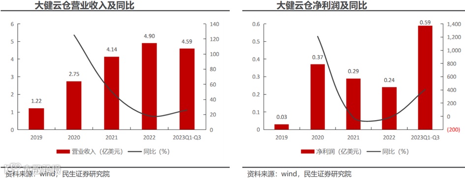 大健云仓为大件商品出口的B2B交易平台,主营大型家居、家电、健身器材、园艺等高物流成本商品的跨境交易与交付服务。公司前身为人力资源服务商,2014年转型跨境B2B业务,2021年更名为大健云仓,2022年8月于纳斯达克上市。