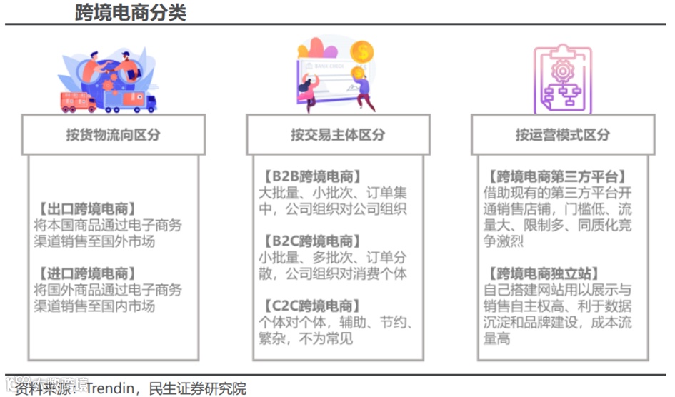 按货物流向分为出口与进口;按交易主体分为B2B、B2C、C2C,其中B2B以集中化订单为主,B2C则以分散化小批量订单为主;按运营模式分为第三方平台与独立站:第三方平台门槛低但竞争激烈,独立站利于品牌建设但流量成本高。