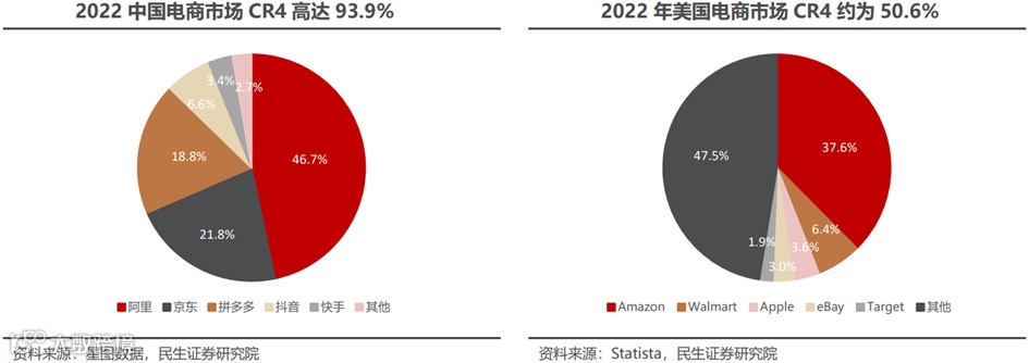 中国电商市场高度集中,2022年阿里、京东、拼多多、抖音合计GMV占比达93.9%;而美国Amazon、Walmart、Apple、eBay合计仅50.6%,垂类平台如Etsy、Wayfair分流明显,竞争格局更分散。