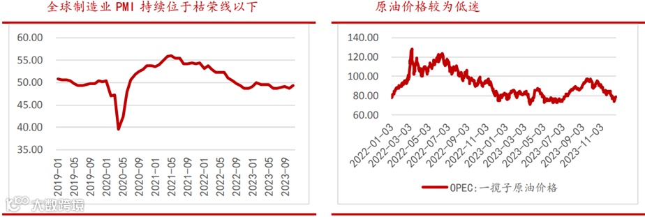 国际运输以海运为主,成本受宏观经济、运力供给与地缘政治影响。2021年起全球造船订单激增,船舶交付周期约三年,2023年起完工量持续高位,预计2024年运力供给充足。叠加全球制造业PMI持续低于荣枯线,贸易需求偏弱,集运市场或将呈现供给过剩,国际运价有望维持低位。