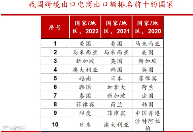 美国连续两年为中国最大跨境电商出口目的地,同时马来西亚、新加坡、越南、泰国、菲律宾等东南亚国家出口额排名上升,市场多元化趋势明显。