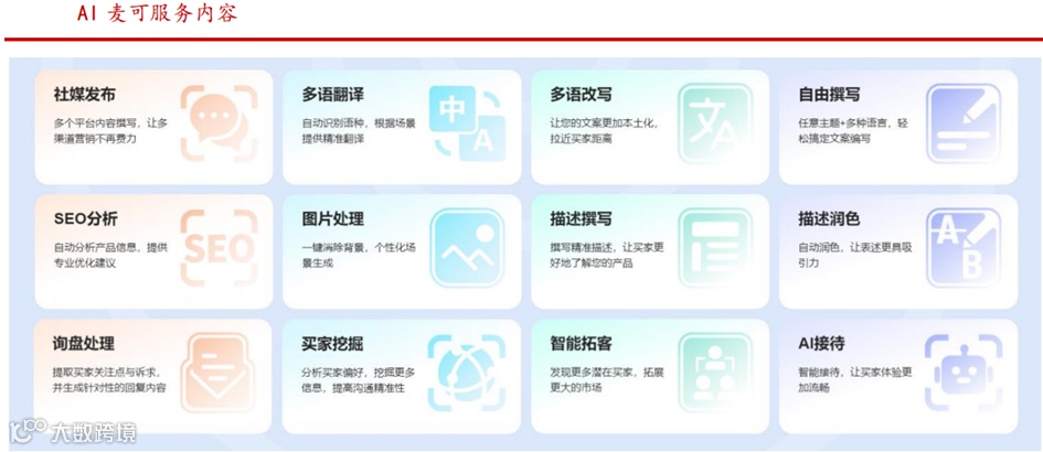 中国制造网推出的“AI麦可”3.0具备内容生成、产品发布、商机跟进等功能,以“数智员工”形态服务外贸企业,月费1980元,助力卖家降本增效[13]。