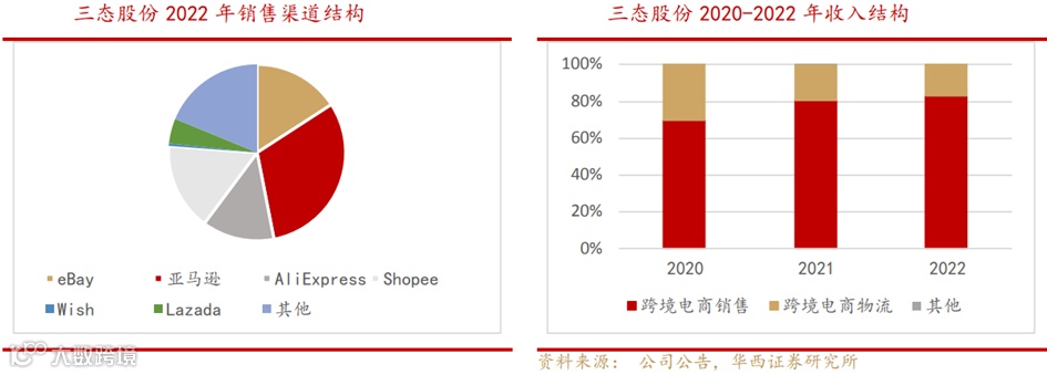 三态股份自2007年起专注跨境电商零售,2009年拓展跨境物流业务,形成以数据智能为基础的生态体系。2022年跨境电商与物流业务收入占比分别为83%、17%。