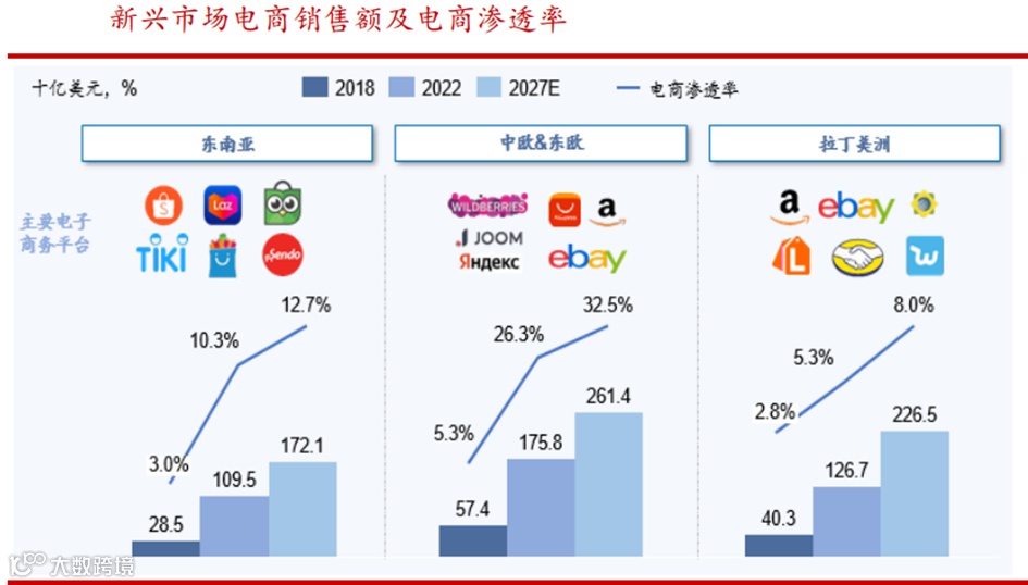 疫情后多国线上购物渗透率显著提升,部分国家增长超3个百分点。东南亚新兴市场如印尼、马来西亚、越南电商渗透率不足5%,增长潜力巨大。