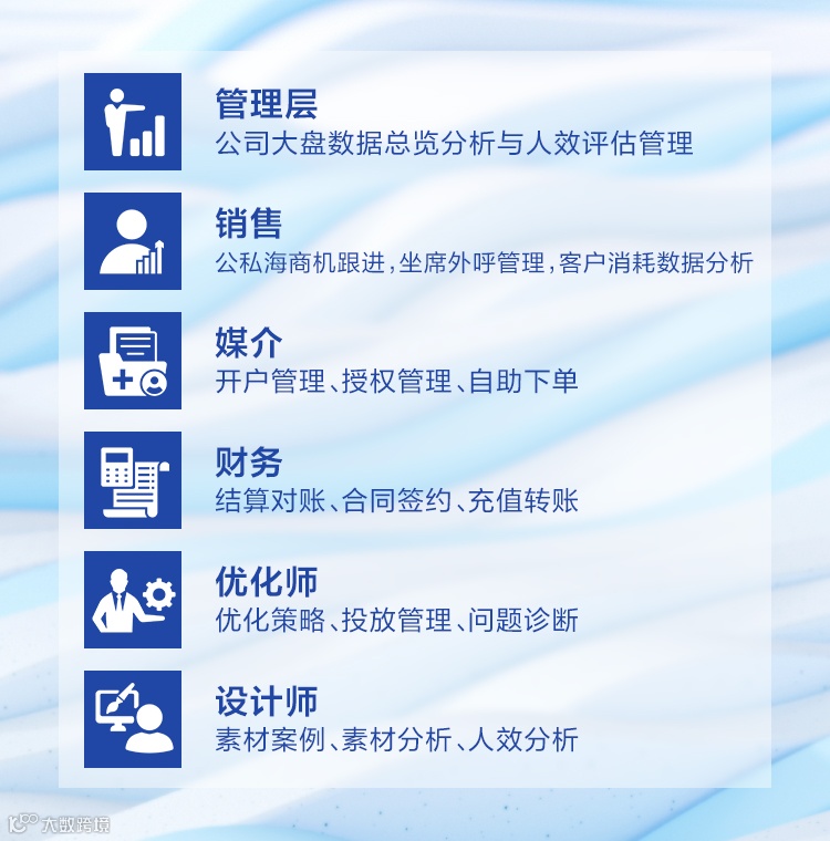管理层可通过平台实现公司整体数据洞察与人效评估;销售人员可进行商机跟进与客户消耗分析;优化师则能依托投放策略开展广告优化与问题诊断,全面提升团队协作效率。