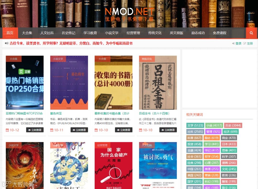 NMOD是一个提供全-网电子书资源下载的网站,提供人文社科、历史传记、学习教育、小说文学、经营管理、传统文化、英文原版、励志成功等内容,目前已累计分享约50,000部左右的电子书资源。