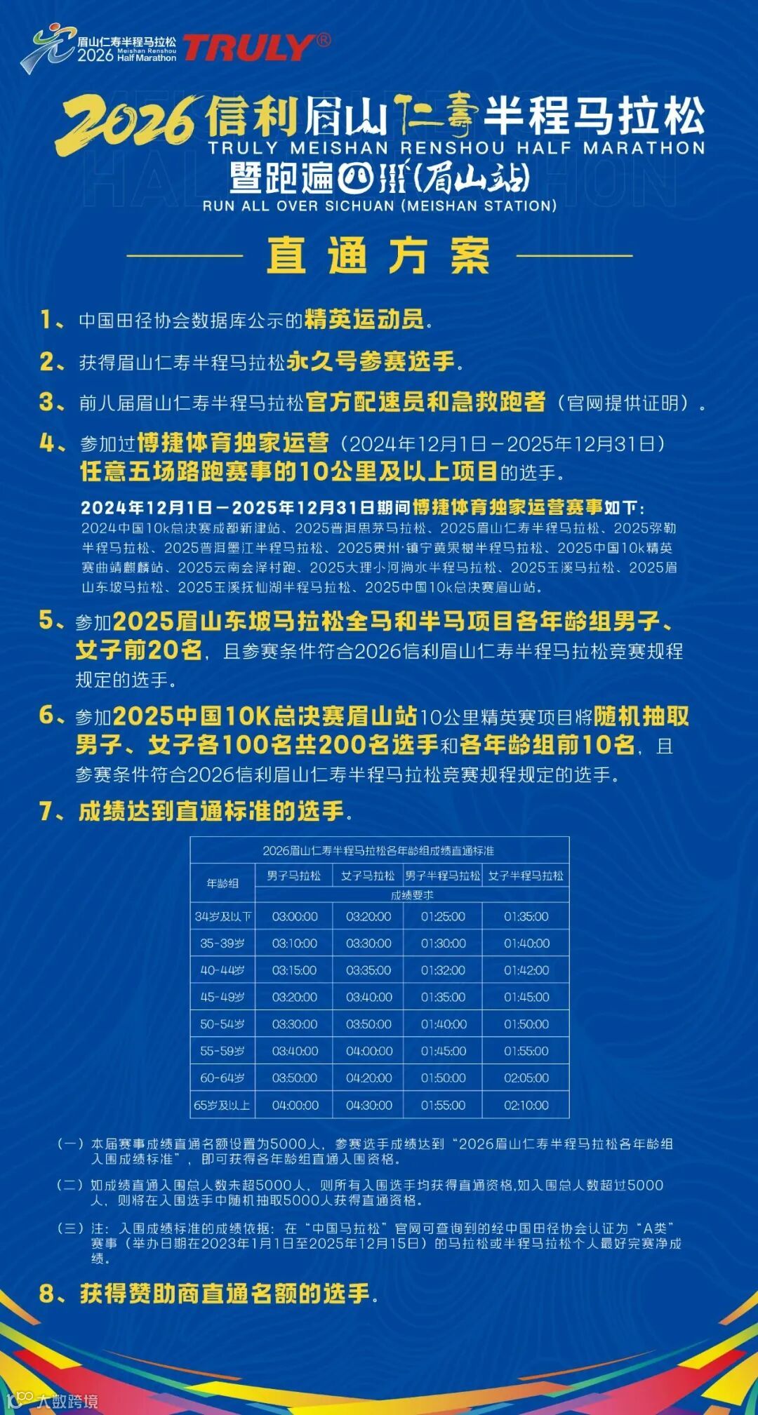 2026信利眉山仁马直通标准再优化,本届赛事成绩直通名额设置为5000人,如成绩直通入围总人数未超5000人,则所有入围选手均获得直通资格,如入围总人数超过5000人,则将在入围选手中随机抽取5000人获得直通资格。