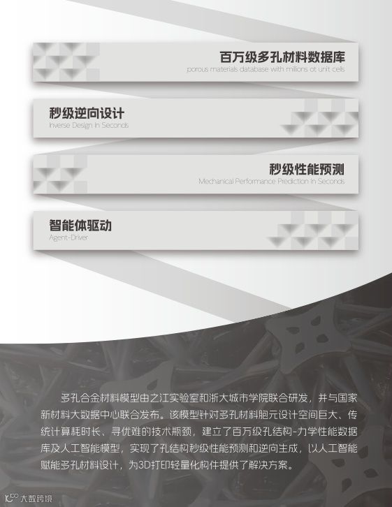 作为新材料大数据中心联合发布的成果之一,多孔合金材料模型由之江实验室与浙大城市学院联合研发,针对多孔材料胞元设计空间大、传统计算耗时长的技术瓶颈,依托百万级孔结构-力学性能数据库与人工智能模型,实现孔结构秒级性能预测与逆向生成,旨在破解多孔材料高效设计难题,为 3D 打印轻量化构件研发提供关键支撑。