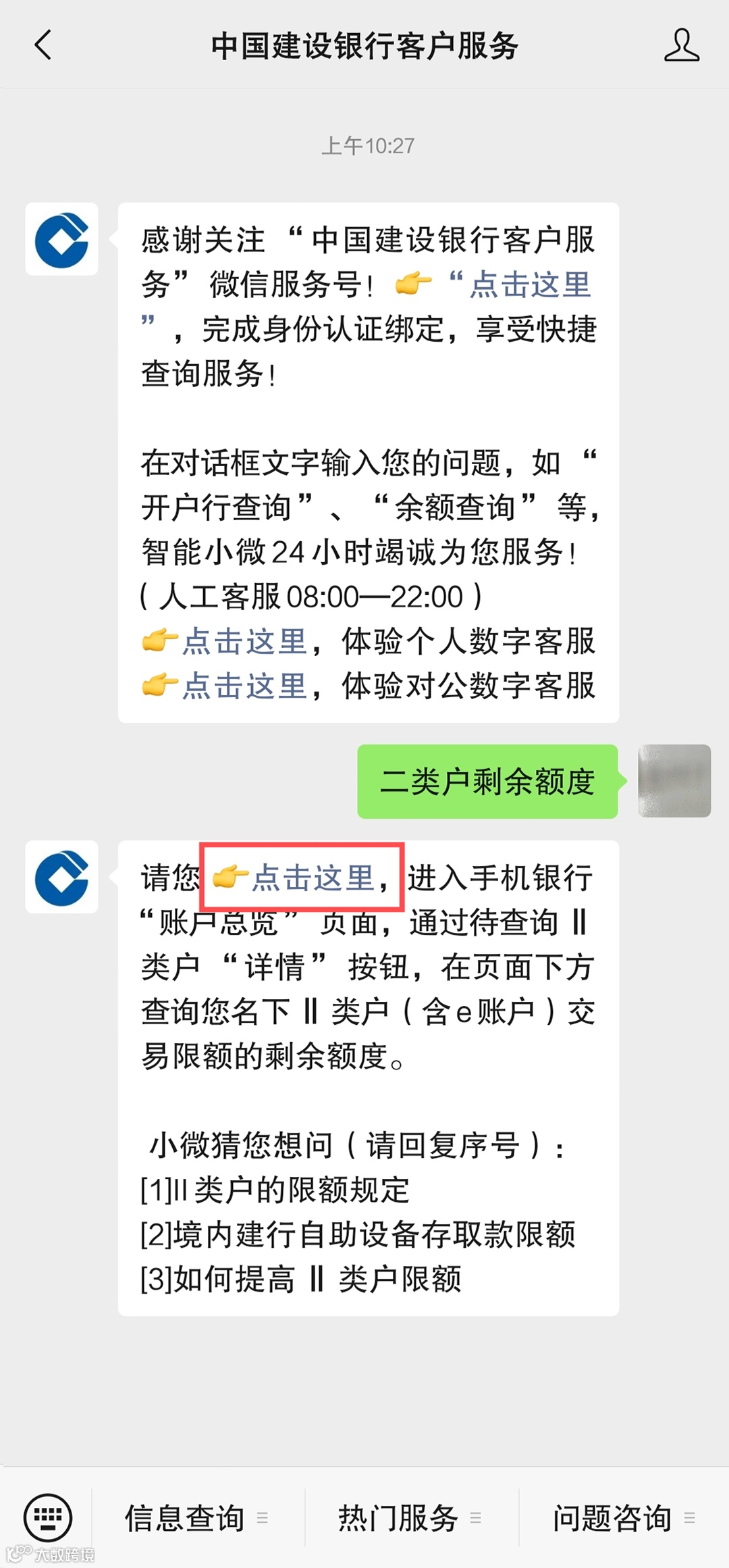 您可关注并进入“中国建设银行客户服务”微信服务号,对话框中输入“二类户剩余额度”,通过推送链接直达“中国建设银行”APP“账户总览”页面,点击待查询Ⅱ类户“详情”按钮,即可在页面下方查看出入金剩余额度。