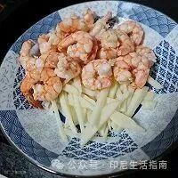 - 水烧开后放入芦笋,沸煮3分钟;再加入虾,煮约2分钟后捞出。