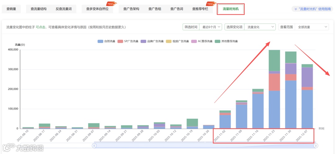接着,通过 Sif【流量时光机】聚焦该产品自身的详细流量走势,可以观察其变化与市场趋势是否同步——是已提前下滑,还是仍在延后冲高?结合市场与自身产品的流量曲线,便能清晰判断后续两周应当采取积极推广还是收缩策略。
