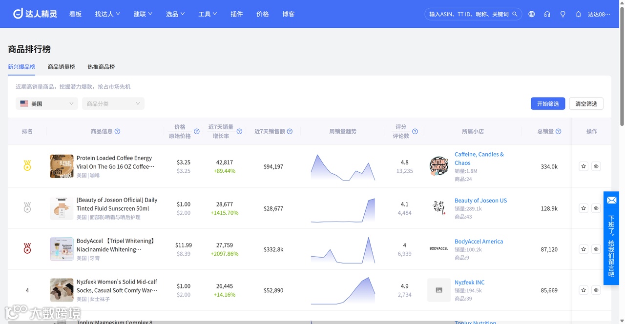 达人精灵汇集了TK平台亿级商品数据,提供商品销量榜、新兴爆品榜、热推销量榜等多维精选榜单,支持商品搜索及多维条件过滤,帮助卖家快速洞察市场趋势,快速定位潜力商品,精准把握涨得快、需求高、竞争小的市场新机会。