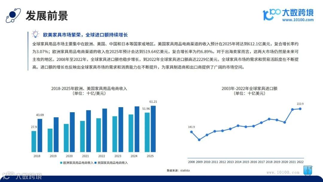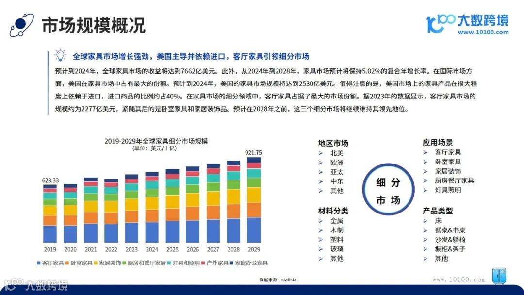 通过分析全球家具市场的现状、发展趋势以及面临的挑战,对市场数据的细致梳理和未来趋势的科学预测,大数跨境希望能够帮助大家把握行业发展的脉搏,识别潜在的增长点,从而在竞争激烈的跨境电商市场中占据先机。