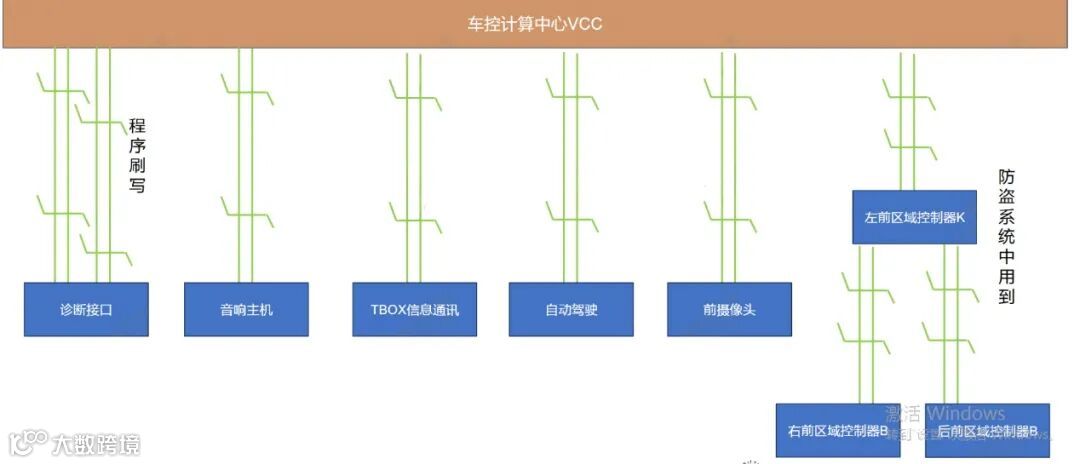 国内一般是非交叉域架构,但区域控制器都有以太网端口与中央域控制器连接,例如比亚迪的纯电车型都是如此,而特斯拉的域控制器是没有以太网接口的。