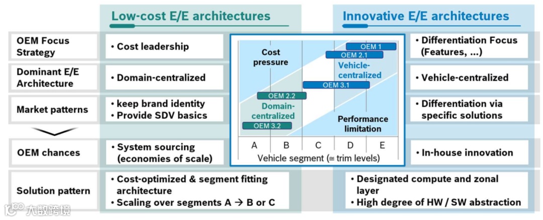 文中特别指出中国新兴造车企业为了保持E/E(电子/电气)架构先进性,不惜减少利润甚至亏损,而传统车企并不打算这么做,它们放缓采用先进E/E架构,甚至有些掉头转向更落后的E/E架构。