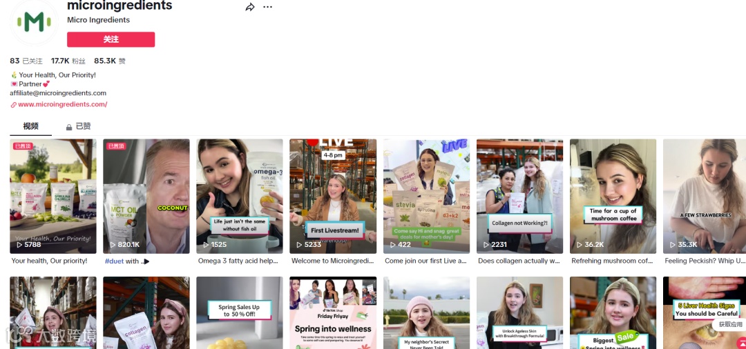 在TikTok、Instagram上,分别拥有1.7万粉丝、1.6万粉丝。Micro Ingredients通过发布食用不同的功效的产品以及具体功能介绍等内容的视频,吸引感兴趣用户关注。