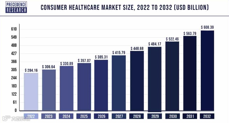 precedenceresearch数据显示,2022年,全球消费者医疗保健市场规模达到2841.6亿美元,预计到2032年将达到6083.9亿美元左右,2023年至2032年的预测期内复合年增长率为7.91%。