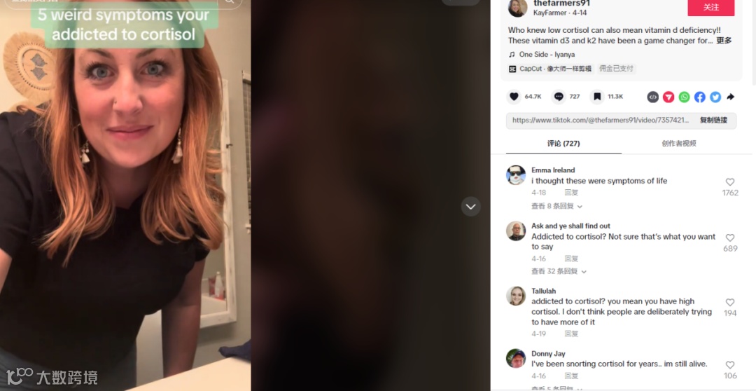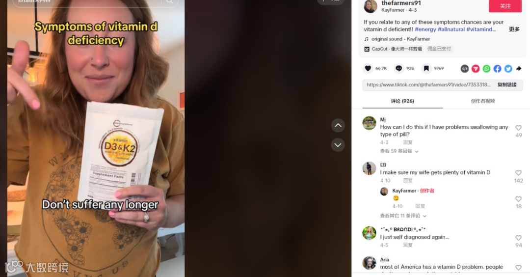 4月3日,@thefarmers91发布的一条关于维生素D产品的视频,获得了380万次播放,6.67万次点赞。