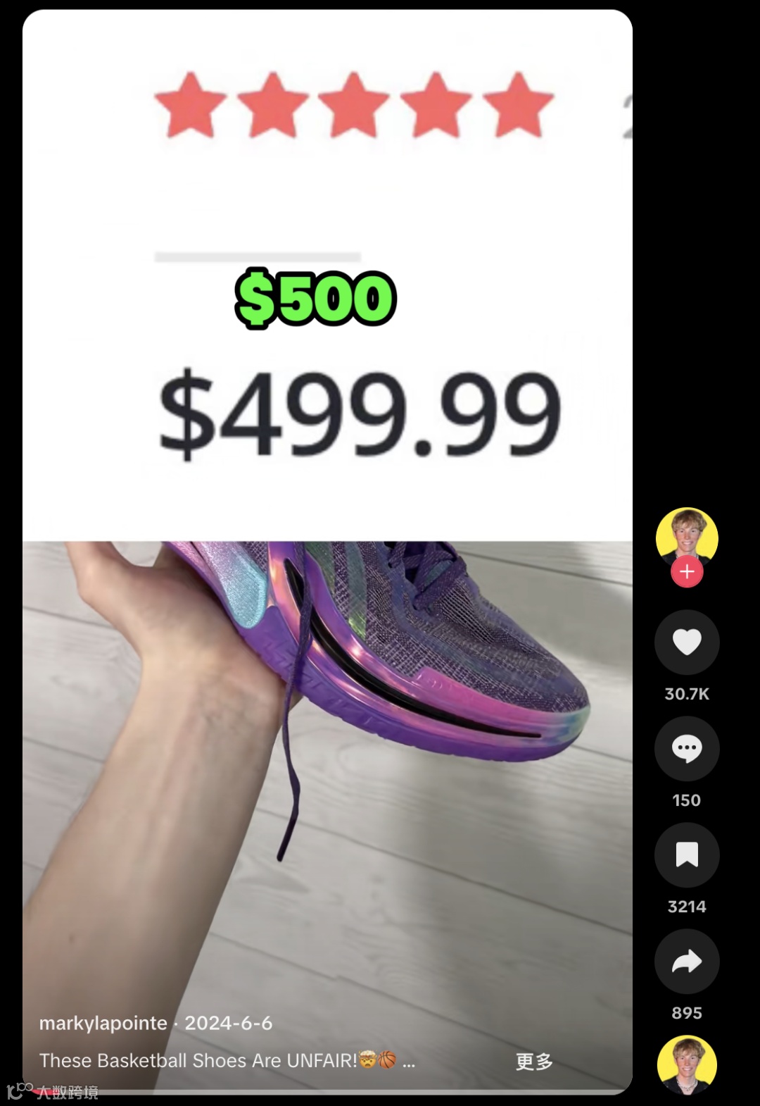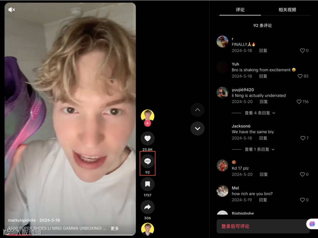 2024年,Mark LaPointe与知名运动品牌李宁展开了合作,共同推出了两支推广视频,均取得了五十万级别的播放量,点赞数均突破了2万+,评论区充满了积极反馈,许多粉丝都在询问折扣链接。这次合作的成功不仅在于LaPointe本身的影响力,还得益于他精心策划的视频内容。在拍摄过程中,LaPointe充分展示了李宁运动鞋的设计亮点和技术优势,同时结合了自己的篮球背景和个人魅力,还展示了近期李宁的折扣价格,让观众能够更加直观地感受到产品的价值。