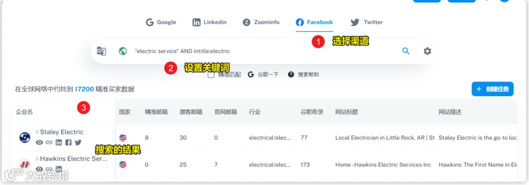 操作示例:搜索提供 electric service 服务且公司名称含 electric 的企业,通过设置关键词即可获得大量相关公司结果。