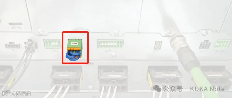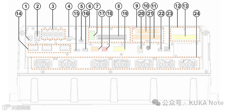 KR C5的一大“焕新点”就是优化了大量不常用的安全接口,做成了选配,这样降低了普通安全级别应用场景的客户的设备采购以及施工的成本。对这一类客户而言只需短接外部使能、控制柜急停(XG58插头),再接好安全门、急停开关(XG11.1)即可。具体接口位置,查看下图KRC5控制器的⑱和⑲接口: