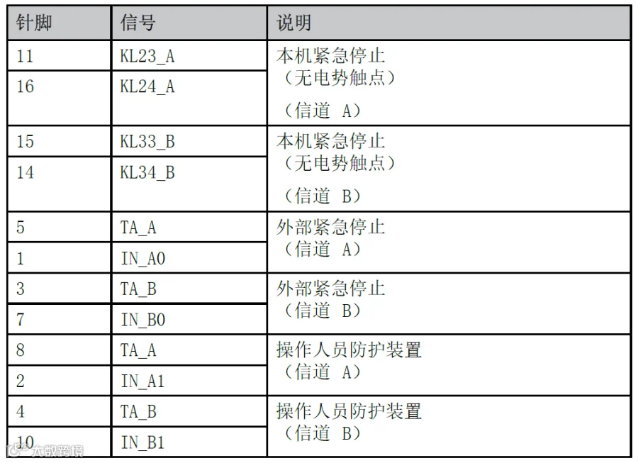 安全接口 XG11.1 可提供 2 个安全输入端(分别是外部急停和操作人员防护装置)和 1 个安全输出端(本机急停信号)。必须通过安全接口 XG11.1 连接好紧急停止装置,或通过上级控制器(例如 PLC)互相连接起来。