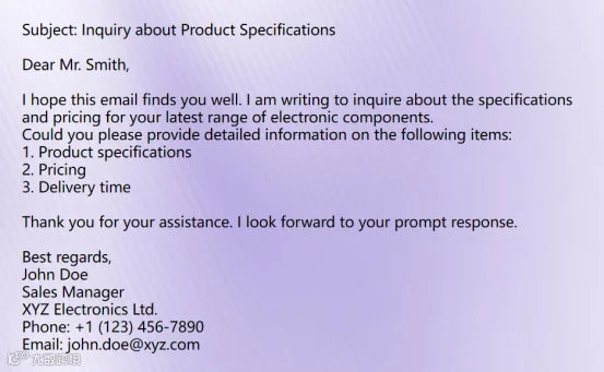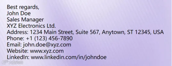 4. 签名(Signature):包含全名、职位、公司名称、联系方式及官网链接。外贸邮件建议补充公司信息以增强专业形象和可联系性。
