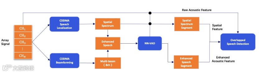 会议中多人同时发言形成混叠语音,严重影响后续识别。达摩院提出融合声学与空间特征的检测方案,利用8通道麦克风阵列信号,结合波束形成、声源定位与神经网络模型,提升检测准确率。