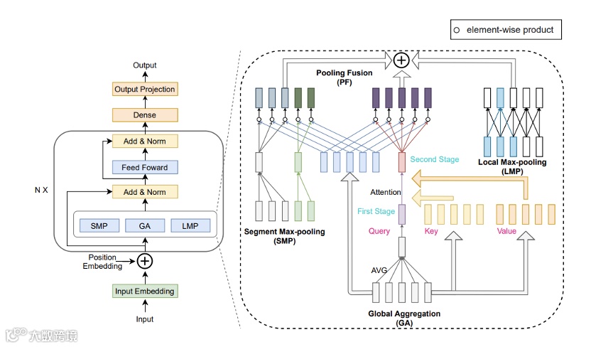 Transformer 模型因自注意力机制的二次计算复杂度,在处理长文本时面临效率瓶颈。为此,达摩院提出新型池化网络 PoNet,采用多粒度池化与池化融合策略,实现线性复杂度下的高效 token 混合。PoNet 在 Long Range Arena(LRA)基准测试中显著优于标准 Transformer,精度接近最优模型 FNet,且在 GLUE 基准上达到 BERT 95.7% 的准确率,超越 FNet 4.5 个百分点。其核心组件包括:全局聚合(GA)、段最大池化(SMP)和局部最大池化(LMP),通过残差连接将多粒度上下文信息融合至各 token。