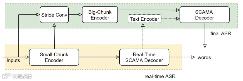 传统语音识别系统由声学模型、语言模型、词典和解码器独立组成,流程复杂且维护成本高。近年来,端到端(E2E)模型成为主流。阿里巴巴语音实验室融合自研的SAN-M网络与Transformer结构,提出Streaming Chunk-Aware Multihead Attention(SCAMA)机制,显著提升识别性能。